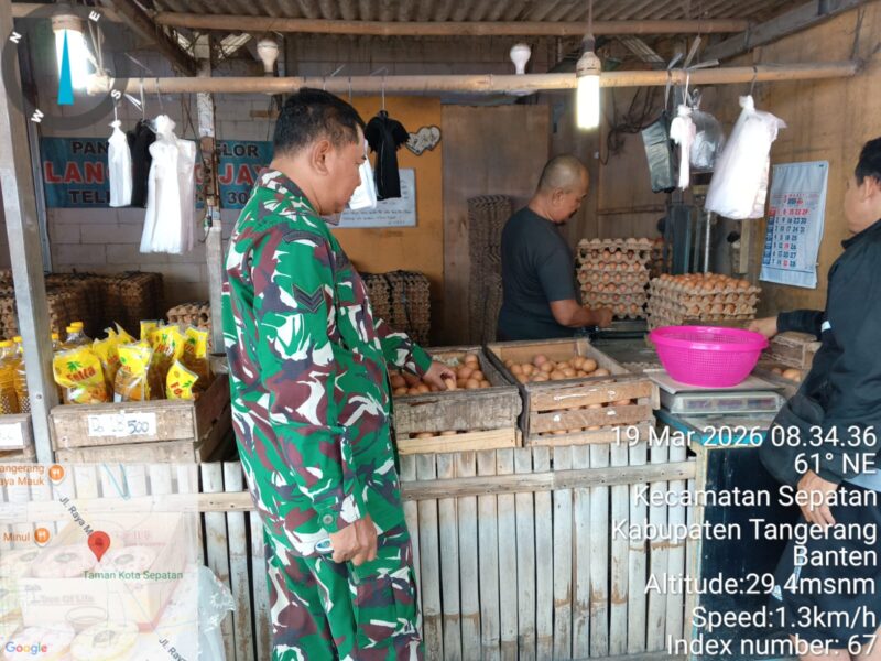 SUARANEWS86.COM || Kodam Jaya, Tigaraksa — Menjelang Hari Raya Idul Fitri 1447 Hijriah, Babinsa Koramil 10/Sepatan, Kodim 0510/Trs Sertu Gunawan melakukan pengecekan harga Sembako di Pasar Tradisional Sepatan Kabupaten Tangerang, Kamis (19/03/2026).