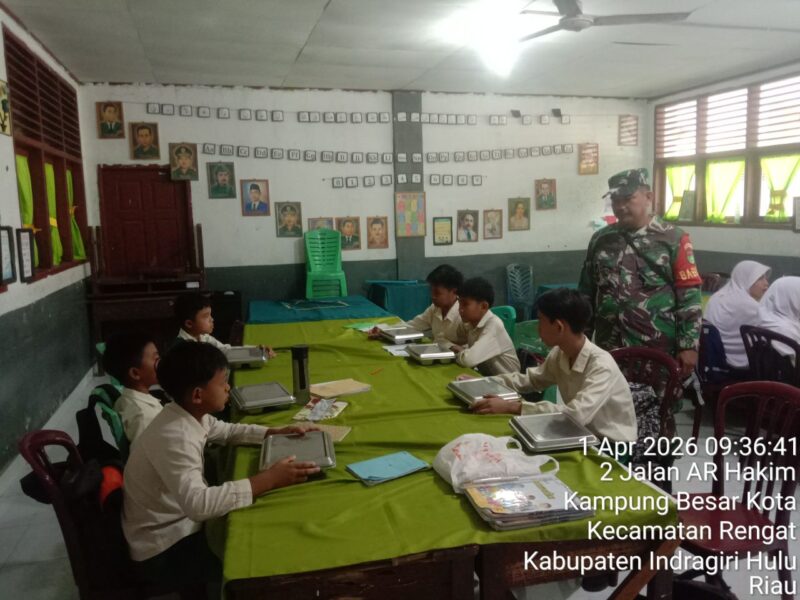 SUARANEWS86.COM || Babinsa Koramil 01/Rengat Kodim 0302/Inhu, Serda Zakirman, melaksanakan pendampingan kegiatan pembagian program Makan Bergizi Gratis (MBG) di SDN 010 Kelurahan Kampung Besar Kota (Kambesko), Kecamatan Rengat, Kabupaten Indragiri Hulu, Provinsi Riau, Rabu (1/4/2026).