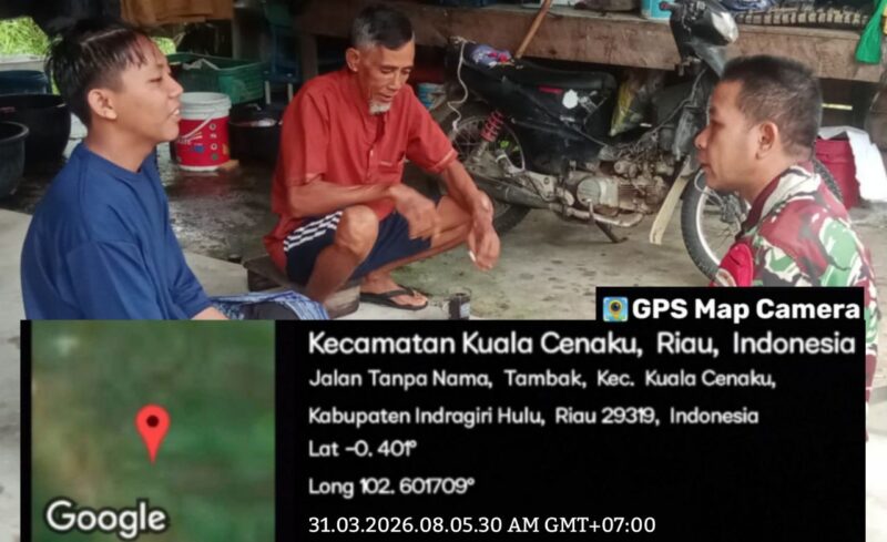 SUARANEWS86.COM || Babinsa Koramil 01/Rengat Kodim 0302/Indragiri Hulu, Sertu Hasanudin, melaksanakan kegiatan Komunikasi Sosial (Komsos) bersama tokoh masyarakat di Desa Tambak, Kecamatan Kuala Cenaku, Kabupaten Indragiri Hulu, Riau, Selasa (31/03/2026).