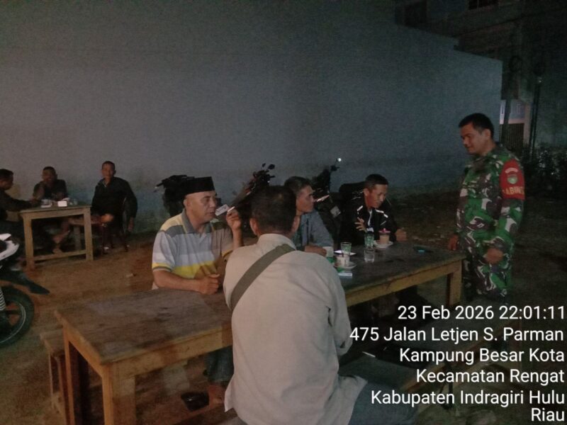 SUARANEWS86.COM || Dalam suasana bulan suci ramadhan upaya menjaga keamanan dan ketertiban masyarakat, Babinsa Koramil 0302-01/Rengat Serda Zakirman terus melaksanakan patroli dan siskamling di wilayah Binaan, Kecamatan Rengat , Kabupaten Inhu, Senin (23/2/2026).