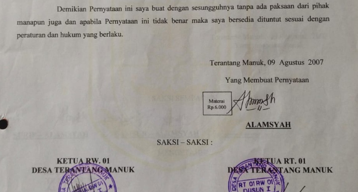 Pada kesempatan yang sama awak media menanyakan kepada petugas ukur tanah Desa Terantang Manuk inisial N terkait copy salinan dari kantor camat yang diduga dibubuhi materai dan ditambahkan tarikan tanda tangan ke arah materai. Padahal pernah dikeluarkan surat hilang SKRG di Polsek Pangkalan Kuras. “Setahu saya, copy salinan tidak ada materainya,” jawab N ke awak media.