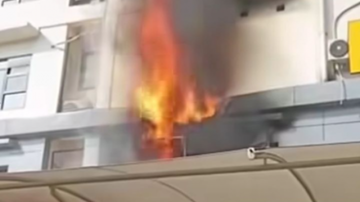 Asap hitam pekat pun mengepul ke udara serta menjejak pada dinding gedung tersebut.