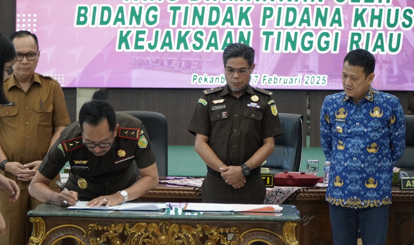 Kegiatan penyerahan aset hasil pengamanan dan penertiban oleh bidang Tindak Pidana Khusus kepada Pemkab Kampar diakhiri dengan Penandatanganan Berita Acara Penyerahan Aset dan Penyerahan Aset secara langsung oleh Kepala Kejaksaan Tinggi Riau kepada Pj. Bupati Kampar. (Rls)