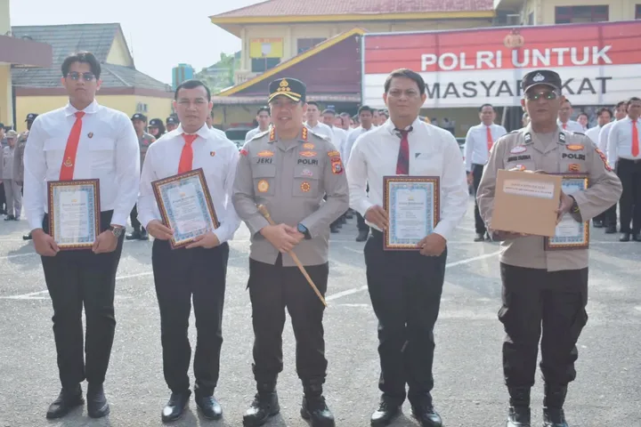 Kapolresta Pekanbaru Kombes Pol Jeki Rahmat Mustika, S.I.K., memimpin langsung upacara penyerahan piagam penghargaan kepada sejumlah personel Polresta Pekanbaru.