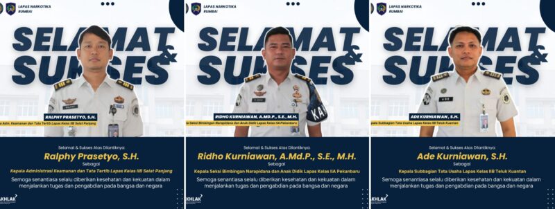 SUARANEWS86.COM || Pekanbaru – Keluarga Besar Lapas Narkotika Kelas IIB Rumbai menyampaikan ucapan selamat dan sukses atas dilantiknya sejumlah pejabat di lingkungan pemasyarakatan yang kini mengemban amanah baru di berbagai Lembaga Pemasyarakatan di Riau.