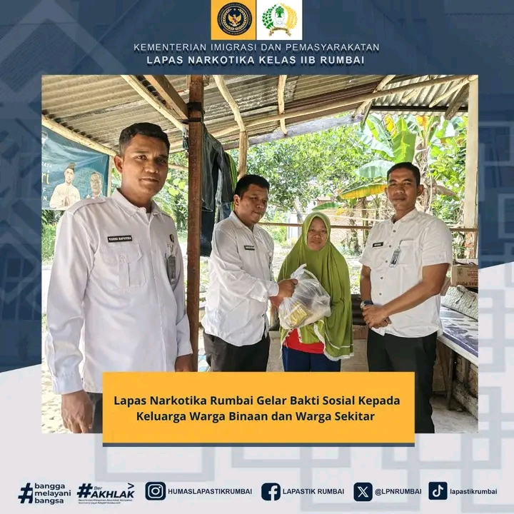 Kepala Lapas Narkotika Rumbai, Reinhards Indra Pitoy menyampaikan, “Kami berharap kegiatan bakti sosial ini dapat memberikan manfaat langsung kepada keluarga warga binaan dan masyarakat sekitar, khususnya mereka yang membutuhkan.