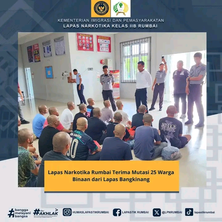 SUARANEWS86.COM || Pekanbaru – Lembaga Pemasyarakatan (Lapas) Narkotika Kelas IIB Rumbai kembali menerima mutasi warga binaan dari Lapas Kelas IIA Bangkinang. Sebanyak 25 orang warga binaan dipindahkan sebagai bagian dari upaya penataan dan distribusi tahanan guna mendukung proses rehabilitasi yang lebih baik dan pembinaan yang optimal, Selasa, (26/08/2025).