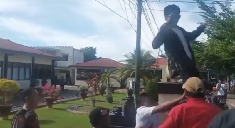 SUARANEWS86.COM || Demonstrasi massa di Polres Palopo, Sulawesi Selatan (Sulsel), nyaris diwarnai keributan. Seorang orator didorong oknum polisi hingga terjatuh dan terbentur ke lampu pagar saat menyampaikan aspirasinya.