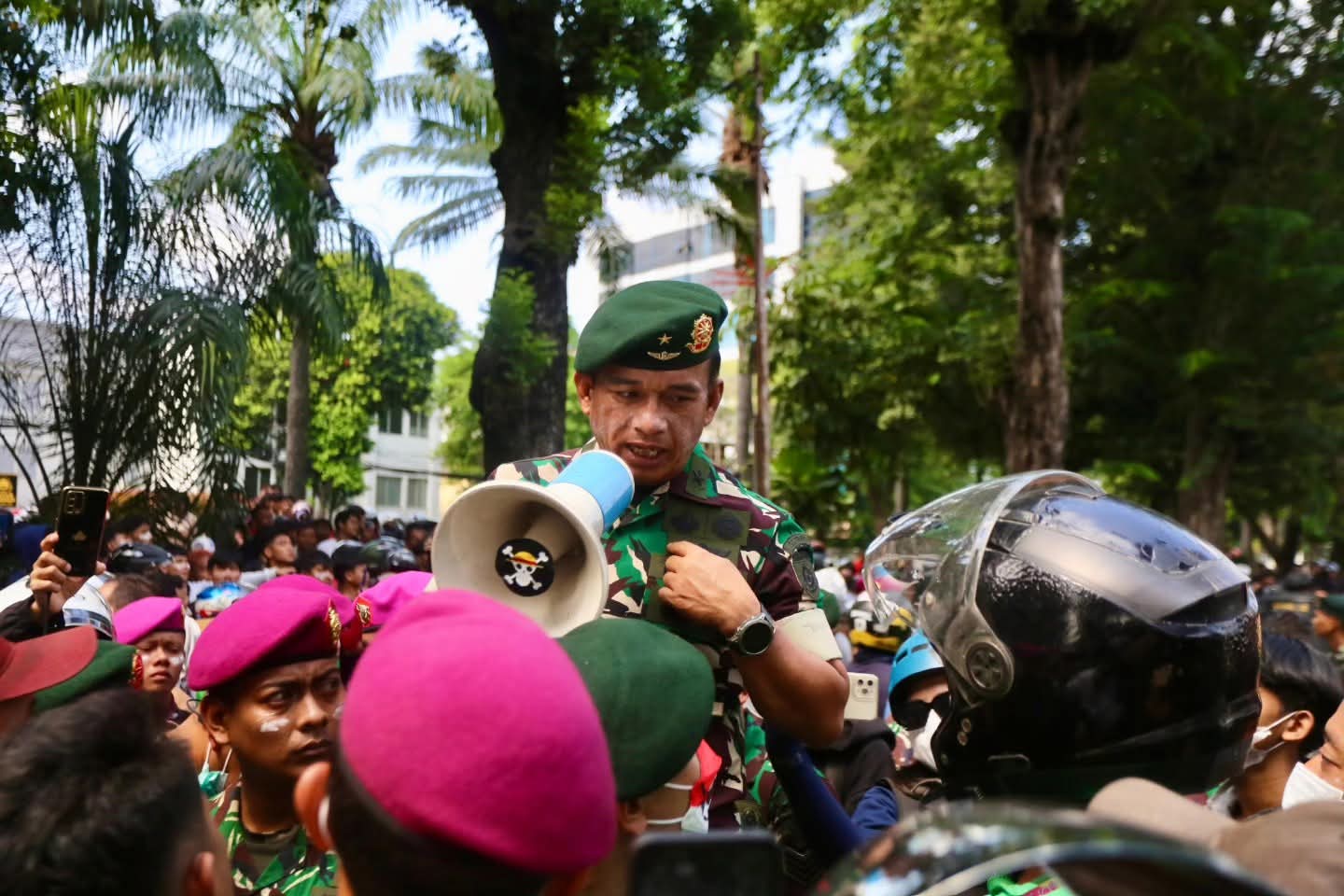Di tengah memanasnya situasi, Asisten Intelijen (Asintel) Kaskostrad Brigjen TNI Muhammad Nas turun langsung menenangkan massa, melakukan mediasi dengan sejumlah perwakilan pendemo, mendengarkan aspirasi, sekaligus memastikan kondisi tetap kondusif.