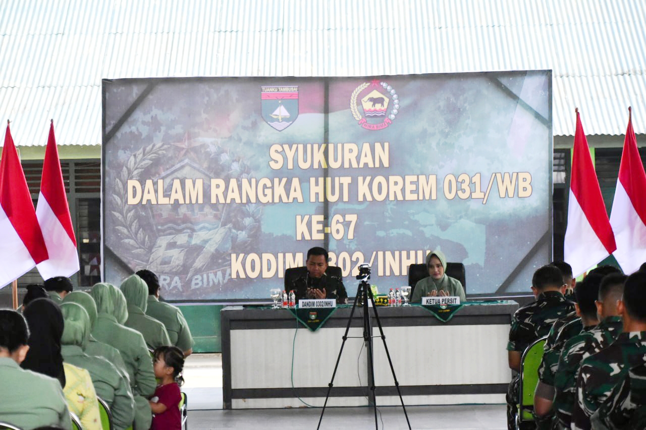 SUARANEWS86.COM || Dalam rangka memperingati Hari Ulang Tahun (HUT) Korem 031/Wira Bima (WB) ke-67, Kodim 0302/Inhu-Kuansing menggelar acara syukuran yang dilaksanakan di Aula Makodim 0302/Inhu, Jalan R. Suprapto, Kelurahan Sekip Hilir, Kecamatan Rengat, Kabupaten Indragiri Hulu, Senin (20/4/2026) sekitar pukul 08.30 WIB.
