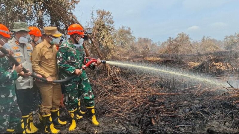 SUARANEWS86.COM || Pangdam I Bukit Barisan Mayor Jenderal TNI Rio Firdianto meninjau lokasi kebakaran hutan dan lahan di Rokan Hilir, Riau. Bahkan jenderal bintang dua itu turun langsung memadamkan.