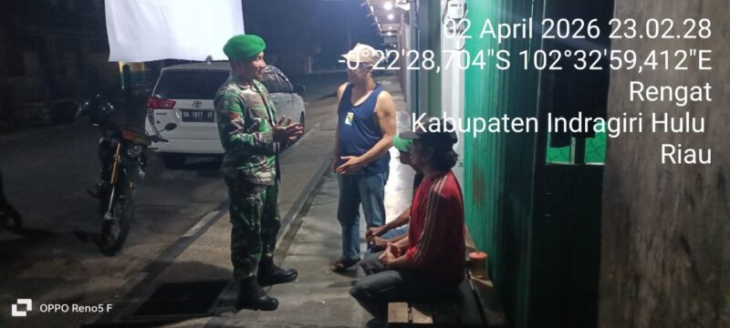 SUARANEWS86.COM || Peran aktif Babinsa dalam menjaga keamanan wilayah terus ditunjukkan melalui kegiatan patroli malam. Seperti yang dilakukan Babinsa Koramil 01/Rengat Kodim 0302/Inhu, Koptu Mukhlis, yang melaksanakan patroli siskamling di wilayah Kecamatan Rengat, Kabupaten Indragiri Hulu, Kamis malam (02/04/2026).