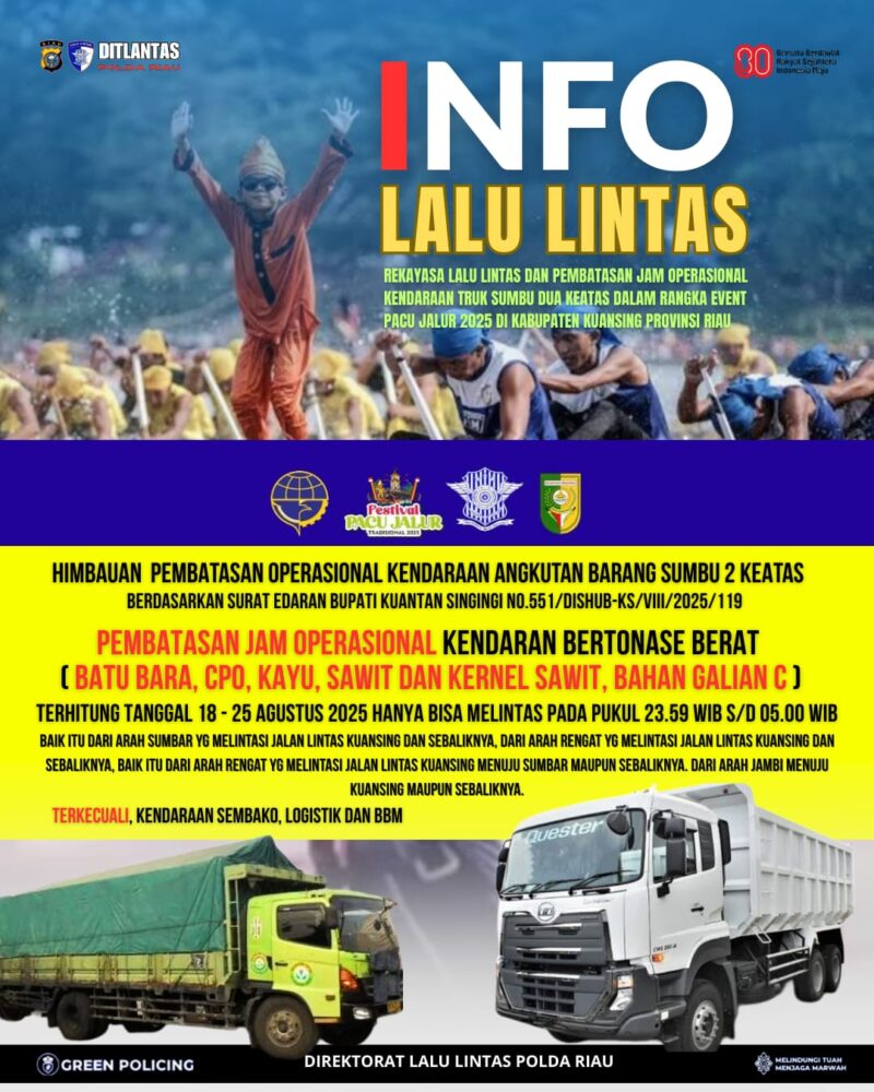 SUARANEWS86.COM || Dalam rangka mendukung kelancaran perhelatan Festival Pacu Jalur 2025 di Kabupaten Kuantan Singingi (Kuansing), seluruh pengemudi angkutan barang dengan sumbu dua ke atas diimbau untuk mematuhi aturan pembatasan jam operasional yang telah ditetapkan.