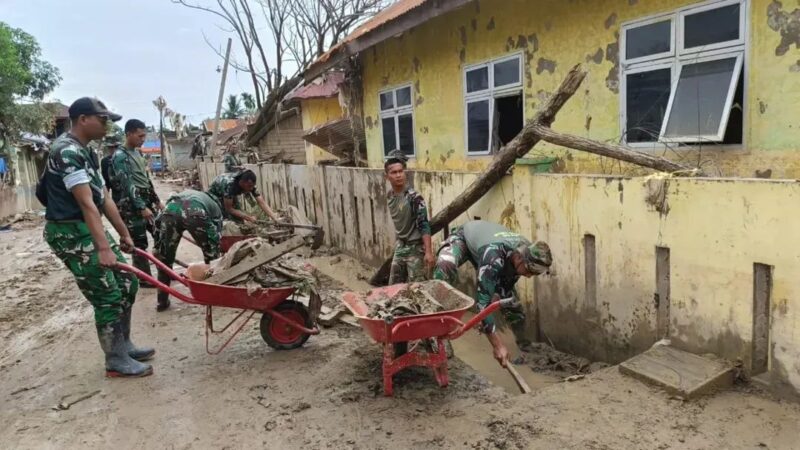 Kegiatan pembersihan diawali dari area halaman sekolah yang paling parah terdampak banjir, di mana lumpur tebal, kayu, serta sampah masih menutupi sebagian besar permukaan tanah. Selanjutnya, prajurit membersihkan ruang-ruang kelas agar dapat kembali digunakan dengan aman dan nyaman. **