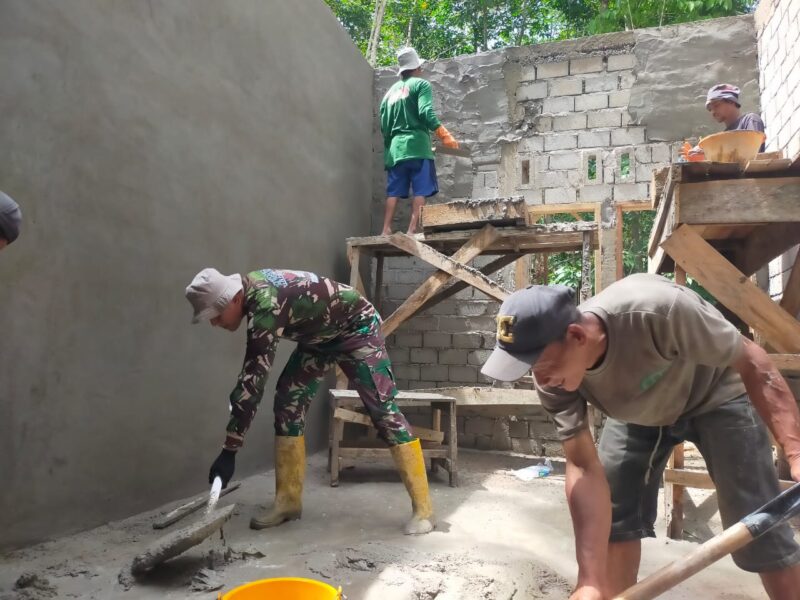 Dimana Satgas TMMD bersama warga fokus melanjutkan pekerjaan plesteran dinding di kediaman Bapak Hamidan.