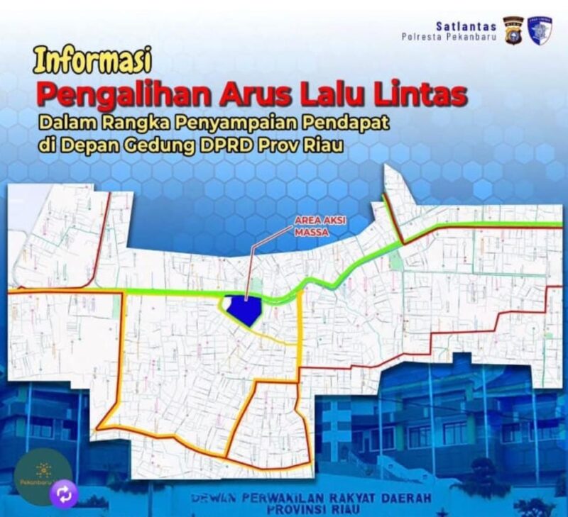 1. Jika massa hanya memenuhi depan DPRD Riau (Jalan Jenderal Sudirman): Kendaraan dialihkan ke Jalan Mekar Sari – Jalan Wonosari, lalu keluar kembali ke Jalan Sudirman arah selatan.