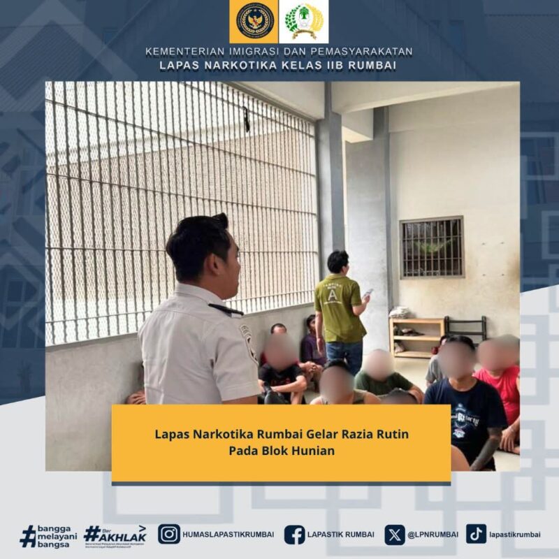 Kegiatan Lapas Narkotika Rumbai ini melalui bidang Adm. Kamtib menggelar razia rutin sebagai bentuk deteksi dini serta meningkatkan keamanan dan ketertiban yang di Lapas Narkotika Kelas IIB Rumbai sekaligus untuk memutus mata rantai peredaran Narkoba serta tindakan penipuan yang kerap melibatkan penghuni Lapas.