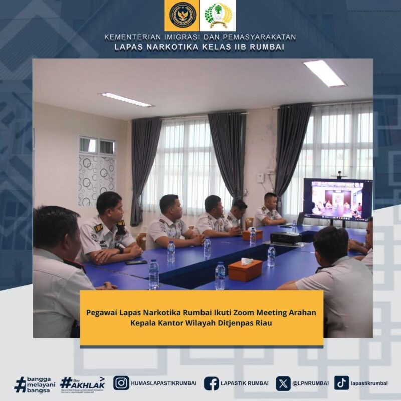 Melalui kegiatan Zoom Meeting ini, diharapkan seluruh pegawai Lapas Narkotika Rumbai dapat memahami dan mengimplementasikan arahan pimpinan dalam pelaksanaan tugas sehari-hari, sehingga mampu mewujudkan penyelenggaraan pemasyarakatan yang profesional, akuntabel, dan berorientasi pada pelayanan publik. (Rls)