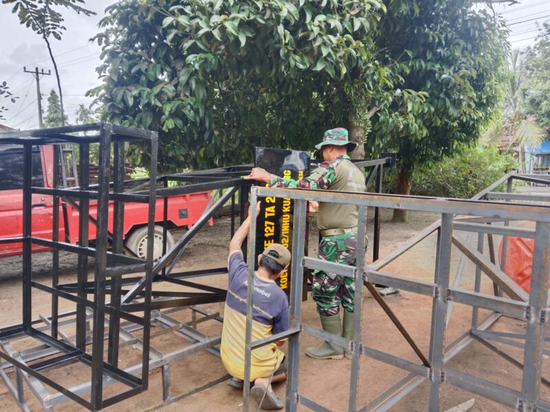 Personel Satgas TMMD dan warga bergotong royong memastikan proses Pembuatan Tower tempat Tanki penampungan Air segera selai namun dalam pembuatan juga diperlukan ketelitian dalam pengelasan agar tidak ada bagian untuk penahan luput dari pengelasan.