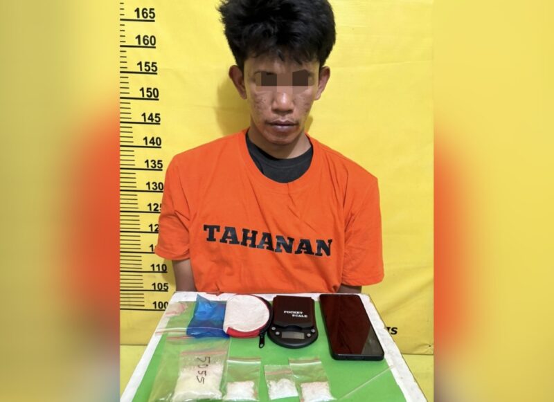 Polisi juga menemukan satu unit timbangan elektrik bertuliskan “Pocket Scale”, satu bungkus plastik klip ukuran sedang berisi delapan plastik klip kecil kosong, satu plastik klip obat warna biru, satu sendok pipet, serta satu unit handphone merek Samsung warna hitam yang diduga digunakan untuk transaksi.